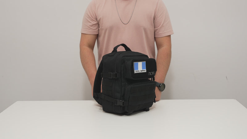 Mochila Roquita 9L compacta y semi impermeable, con sistema MOLLE frontal y lateral, 7 compartimentos y bolsillo trasero seguro. Incluye espacio para tablet de 9.7” (20 × 26 cm). Ideal para uso diario, gimnasio, escuela y paseos.